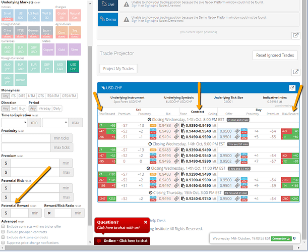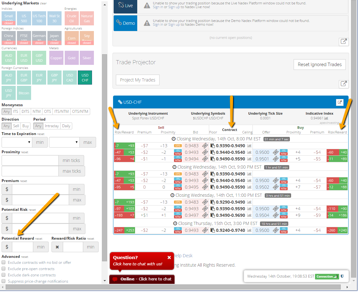 To set up the trade, buy a lower Nadex USD/CHF spread below the market but with its ceiling where the market is trading at the time. Also, sell an upper Nadex USD/CHF spread above the market but with its floor where the market is trading at the time. You want to be sure your spreads have a profit potential of $35 or more combined between them or approximately $17 each. You can use the spread scanner to easily find the spreads you need for your trade. To access it, just go to www.apexinvesting.com. Below is an image of the spread scanner showing example Nadex USD/CHF spreads.