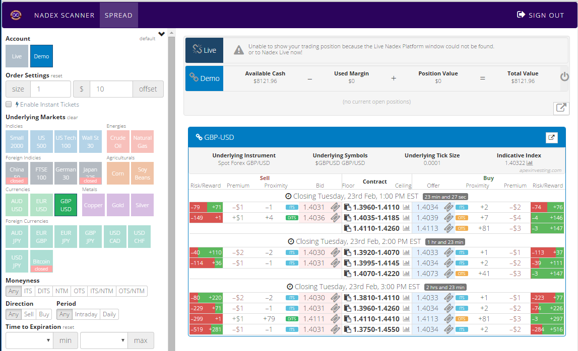 What about stops and risk? Risk may seem very high; however, your realistic risk is at a 1:1 risk/reward ratio, when you set stop limit orders and exit where the market would hit 70 pips up or down. To easily find your spreads at a glance, just go to www.apexinvesting.com. Open the spread scanner and choose your market. You will see the spreads are listed down the center with their floors and ceilings, and the risk reward is listed just to the outside left and right. Click the ticket icon and an order ticket will open where you can submit an order. Be sure to demo the trade before trading live.