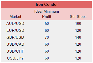 Your Iron Condor should have a combined ideal minimum profit as mentioned below and you should set stop limit orders as well. For example, for Nadex AUD/USD, set two stop limit orders: one where the market would hit approximately 100 pips above and another where the market would hit 100 pips below. Depending on your exact entries, that is where your max 1:1 risk/reward ratio points are. Max profit for the Iron Condor is when the market is in center, back between your two spreads at expiration. Also, be sure to place limit take profit orders. The market may make a move for one side to profit and then pull back and then the other side may profit later as well.