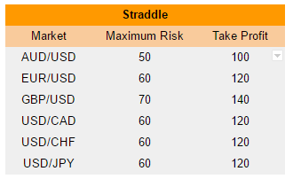 A Straddle is another possible strategy for this news event. To put on a Straddle, you do the opposite of above with the Iron Condor. With the Straddle, buy a Nadex spread above the market but with the floor where the market is trading at the time and sell a Nadex spread below the market but with the ceiling where the market is trading at the time. Using the chart below, you can see each market with the minimum risk and take profit setups. For example on the AUD/USD, each spread should have a maximum risk of approximately $25 for a combined risk of $50. Set your limit take profit orders immediately after placing your trade where the market would hit 100 pips above should the market go up and also 100 pips below should the market go down. Be aware of the deviation levels when trading your straddles and take profit before a deviation level. Each market has its own maximum combined risk and take profit points up or down.