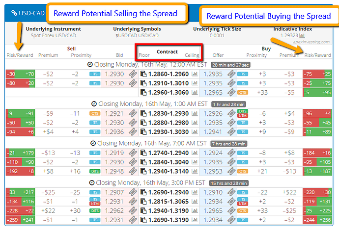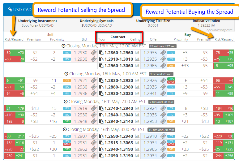 Spreads have defined capped risk; therefore, the trader knows the total risk up front. There is no loss or profit beyond the ceiling and floor. Traders using the spread scanner learn to trade spreads fast and more effectively. To find the right spreads for this strategy, simply find the reward potential for both sides of the Iron Condor, and then verify the other parameters meet requirements. For a glimpse of the layout, see below.