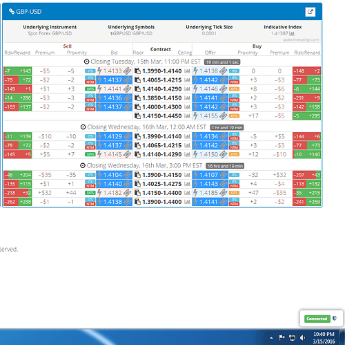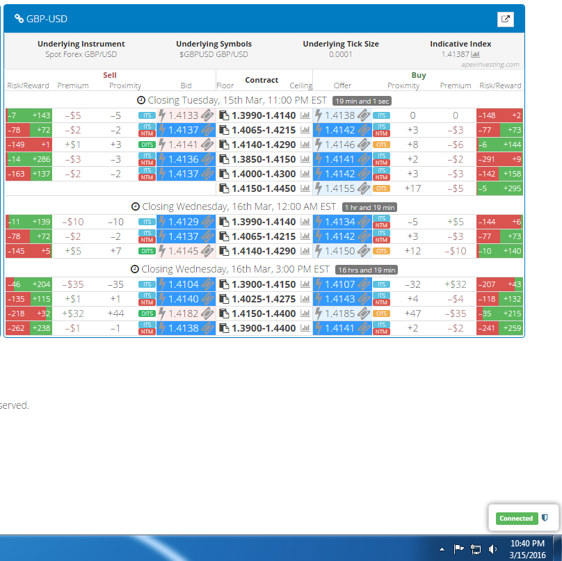 To find just the right spreads at a glance, you can utilize the free Nadex spread scanner available at www.apexinvesting.com. For an example of how easy it is to identify spreads, their floor and ceiling and respective risk reward, see below.