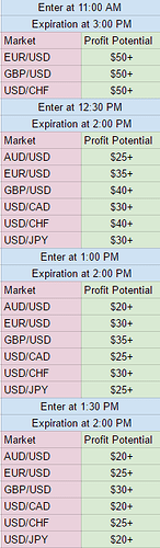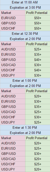 To keep your risk managed at a realistic level, place stop limit orders at the 1:1 risk/reward ratio points. By multiplying your profit potential by two, you will determine those points. The 11:00 AM ET Iron Condor entry for EUR/USD has the profit potential of $50, multiplied by two is 100. Place your stop limit orders 100 pips above and below your entry point to keep your risk/reward at 1:1. Your breakeven points on the trade are easier to determine. They are the amount of your profit potential. For this trade, the breakeven points are where the market hits 50 pips above or below your entry point.